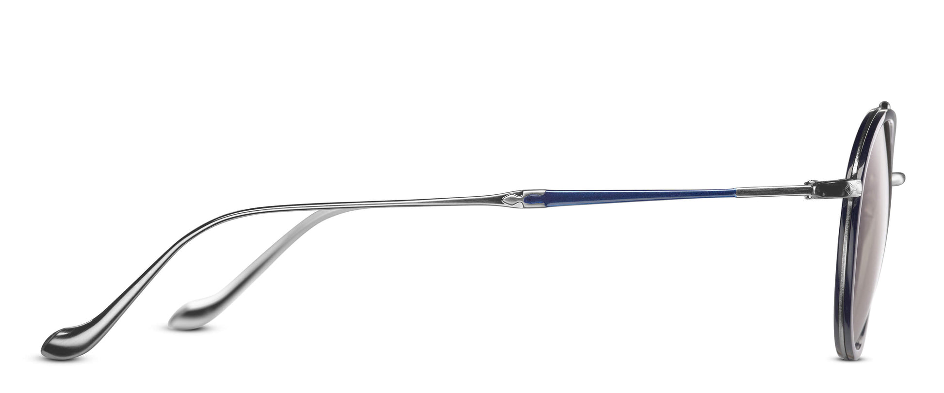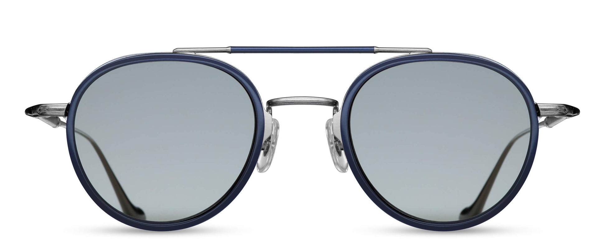 M3064 è un modello da aviatore rotondo contemporaneo con doppio ponte. Il frontale è realizzato in lamiera di titanio e presenta un inserto in acetato giapponese.