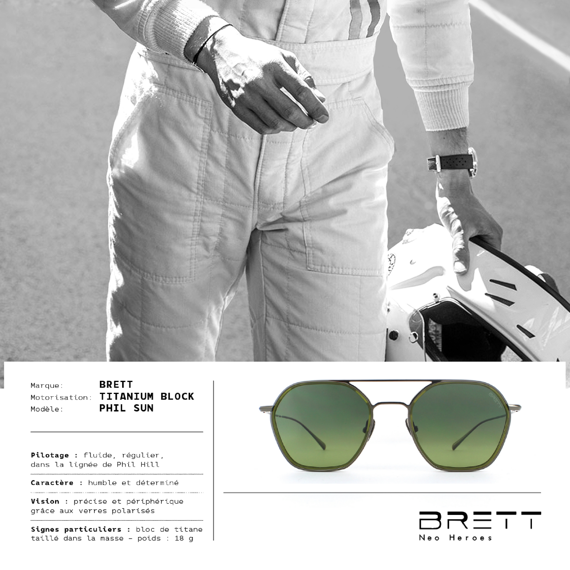 L'ispirazione per questo modello è venuta dai volanti delle auto sportive degli anni '70, veri capolavori di arte artigianale caratterizzati da finiture 'bi-materiale'. L'uso del titanio puro monoblocco tagliato al laser offre una leggerezza notevole.